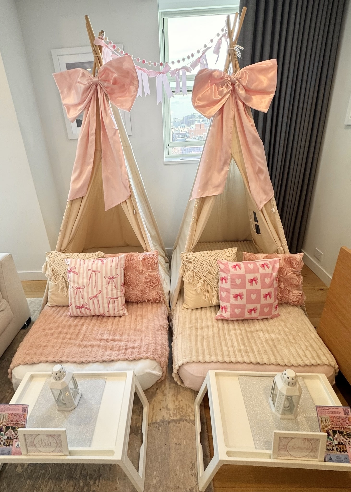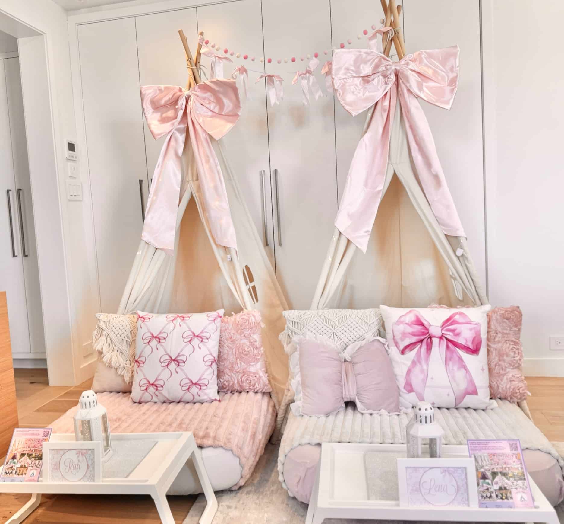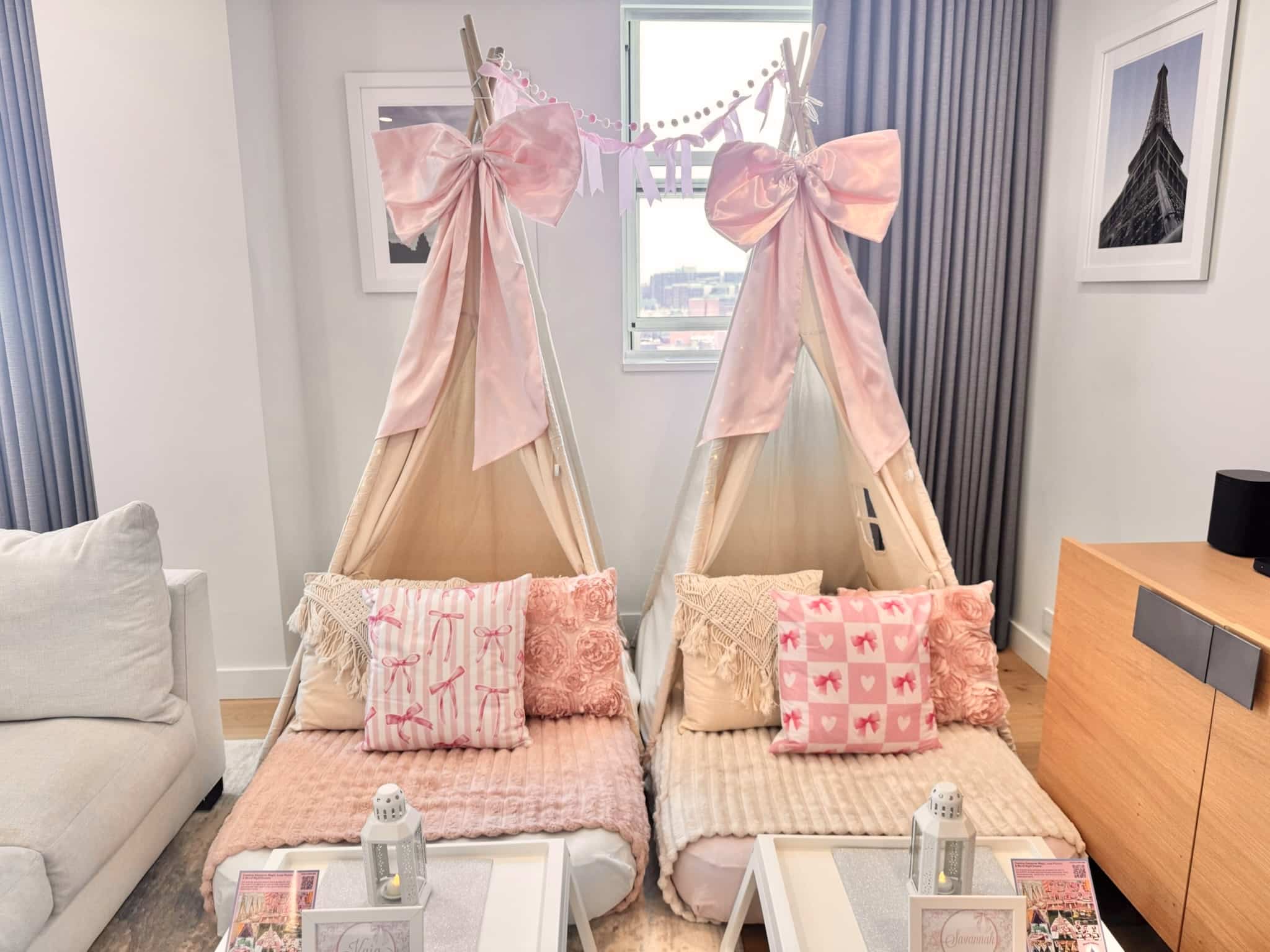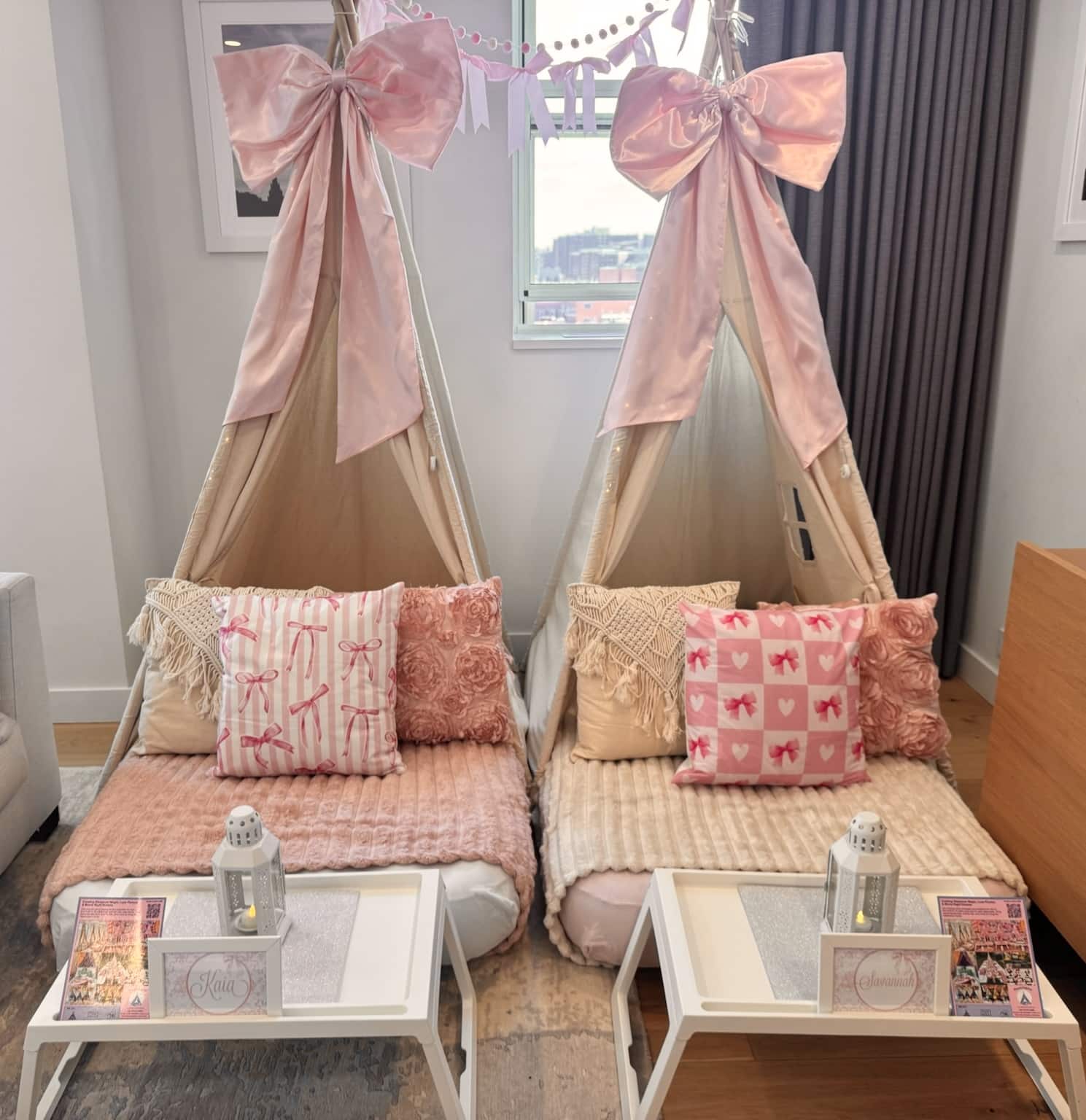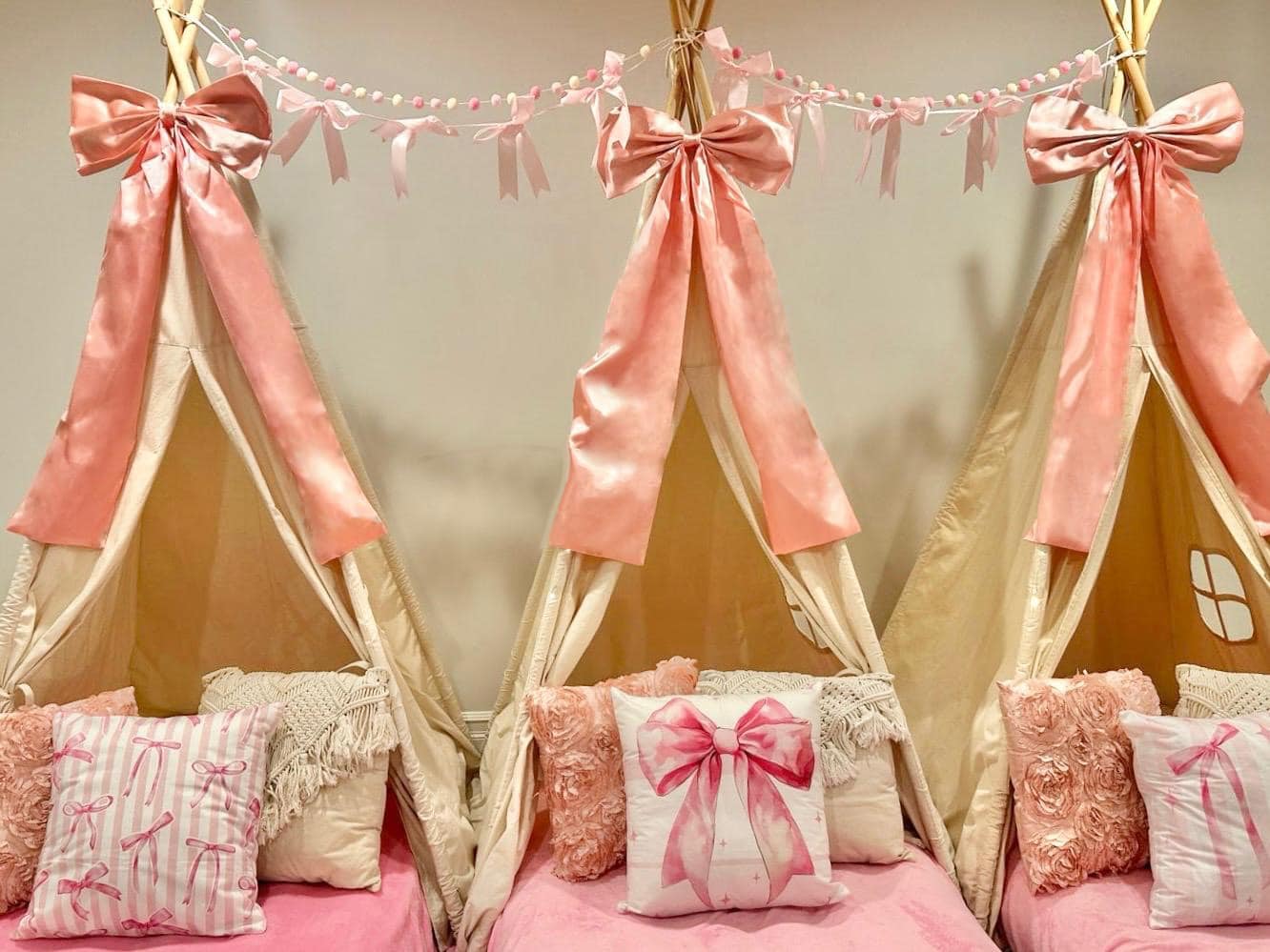 Our Bowtique: Pretty in Pink Sleepover Party Theme is the ultimate blend of sweet, chic, and girly glam- perfect for a dreamy and unforgettable slumber party! Designed with soft pink tones, elegant bow details, and cozy luxe textures, this theme brings fairytale charm with a modern, Instagram-worthy twist. From dainty décor accents to beautifully styled teepees, every detail is thoughtfully curated to create a magical sleepover experience your guests will adore.
